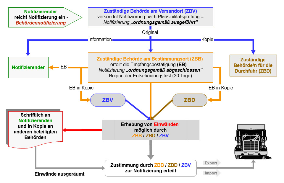 Liegt den beteiligten Behörden der Antrag vollständig vor, so gilt die Notifizierung als „ordnungsgemäß abgeschlossen“ und die zuständige Behörde am Bestimmungsort erteilt die Empfangsbestätigung. Nach Ablauf der Entscheidungsfrist von 30 Tagen erteilen die beteiligten Behörden ihre schriftliche Zustimmung.