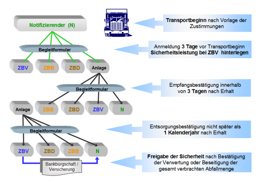 Sollen bestimmte Abfälle grenzüberschreitend verbracht werden, so ist bei der zuständigen Behörde am Versandort eine schriftliche Notifizierung (Antrag auf Erteilung einer Genehmigung zur grenzüberschreitenden Verbringung von Abfällen) vor Transportbeginn einzureichen.